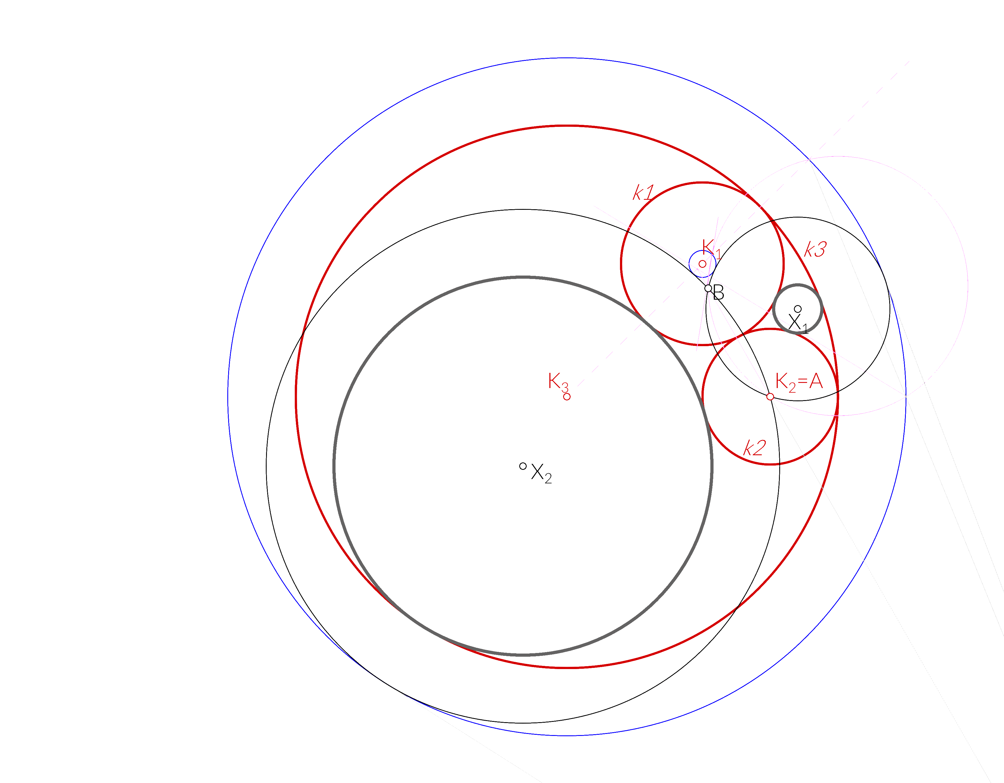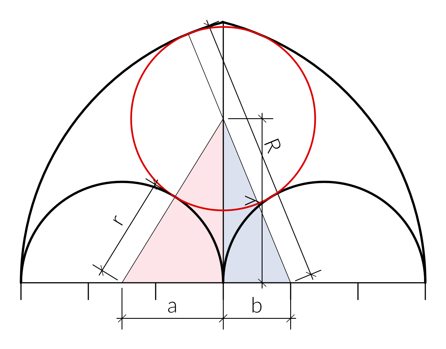 In de gevallen dat de bovencirkel moet gezocht worden tussen niet-concentrische cirkels kunnen we met de hulp van Pythagoras de straal van de bovencirkel vinden. Deze interesseert ons het meest omdat de waarde y (de hoogte van het middelpunt van de bovencirkel t.o.v. de basislijn) voor ons weinig toepasselijk is, gezien het meestal een irrationeel getal betreft. Met deze toepassing vind je onmiddellijk, zonder berekeningen en algebraïsche beslommeringen de straal van deze cirkel.